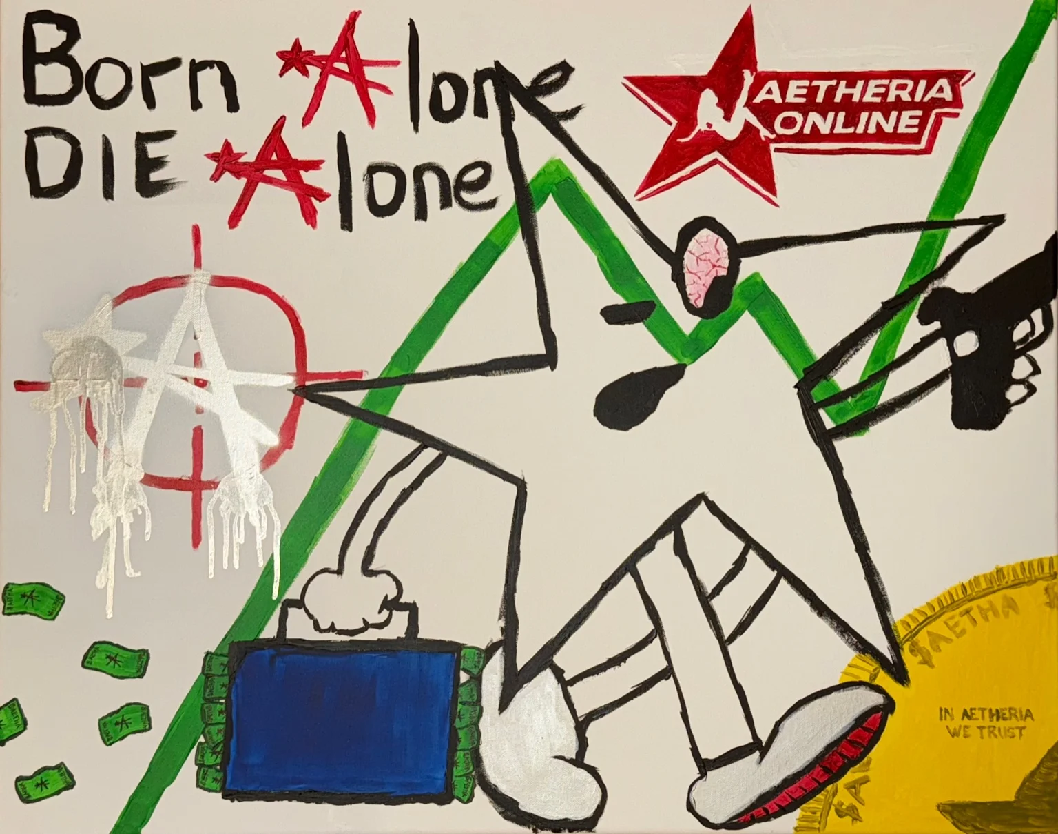 Born Alone. Die Alone. is a visual manifesto for Aetheria, a brand conceived without precedent and built to exist where streetwear, blockchain technology, and culture collide. The slogan replaces traditional A’s with the A-Star, reinforcing Aetheria’s identity as a singular force. The phrase speaks to originality: Aetheria was born alone, without comparison or blueprint, and will stand alone in its execution and vision. At the center of the composition, a shooting star races forward, gripping a briefcase filled with dollar bills marked by the A-Star and AETHA insignia. This symbolizes momentum, ambition, and the transfer of value both cultural and financial. Beneath it, a green upward trendline mirrors the rise of the Aetheria crypto coin, AETHA, representing growth driven by belief, community, and innovation rather than speculation alone. In the lower right, a gold coin stamped with the phrase “IN AETHERIA WE TRUST” serves as a deliberate nod to traditional currency — reimagined through a decentralized future. It reflects trust not in institutions, but in creation, transparency, and ownership. Aetheria is the first streetwear brand of its kind, where every physical garment is paired with a corresponding NFT and an official crypto coin. Existing simultaneously in the digital and physical worlds, Aetheria is built entirely online, yet constructed by hand, grounded in authenticity rather than hype. The crosshair embedded in the piece references the very first shirt designed by Aetheria co-founder Hayden Williams, a symbol that would later define the Small Circle Collection collaboration. Both founders born and raised in Texas, where guns are woven into the cultural landscape, the crosshair represents focus, precision, and intention — not violence, but aim. Overlaying it all is a chrome A-Star, a declaration of futurism and aspiration. As Spongebob once said, “Everything is chrome in the future” and here, chrome becomes a metaphor for forward motion, permanence, and inevitability. This painting is both origin story and prophecy. Hand painted by Aetheria Co-Founder Nick Nolette
